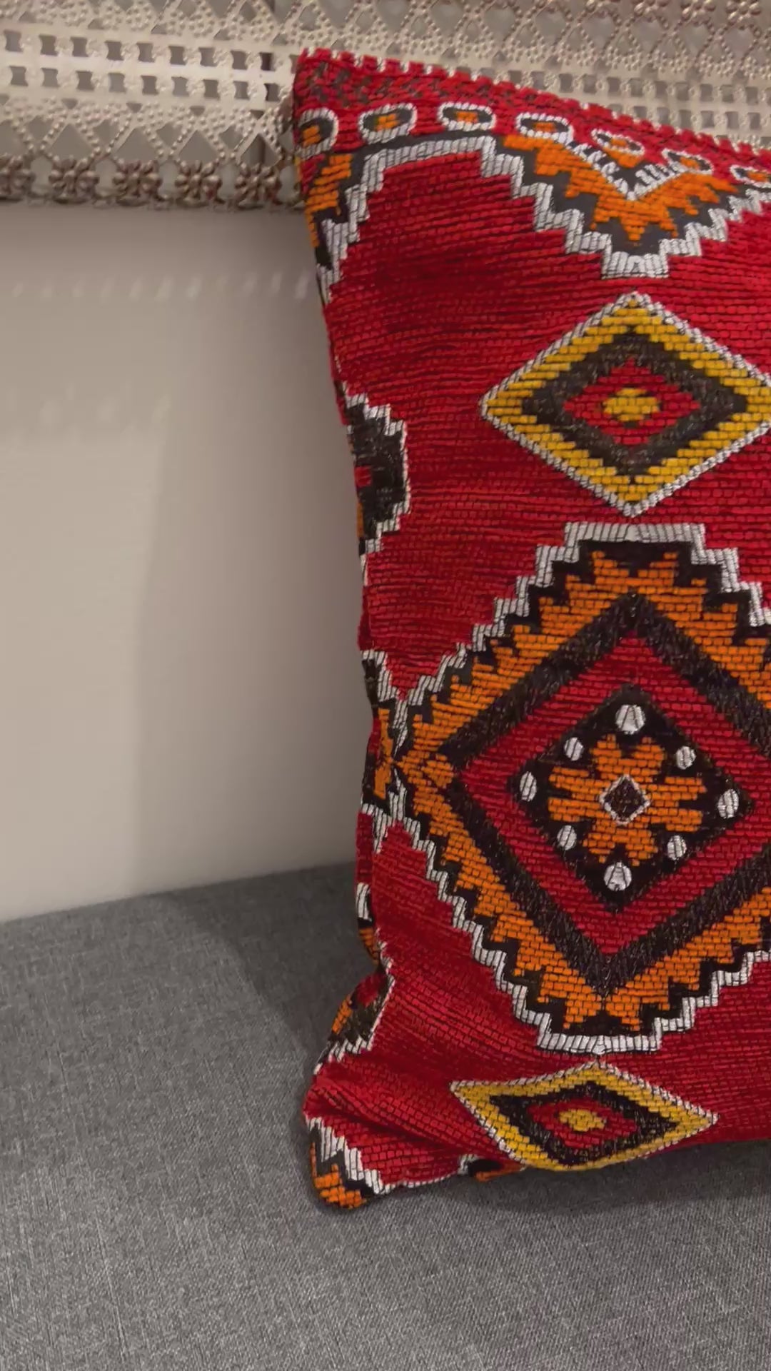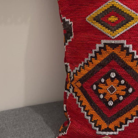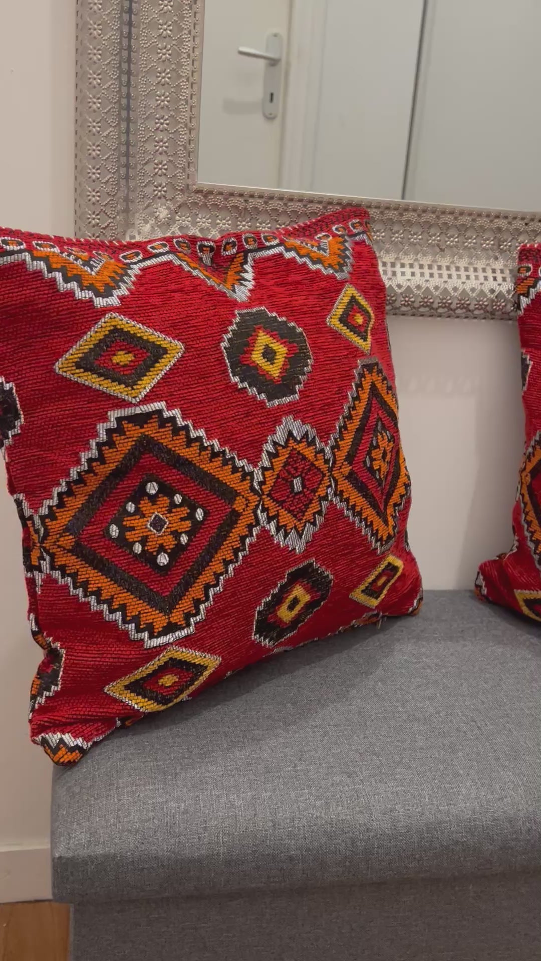 Ajoutez une note d’authenticité à votre décoration avec ce lot de 2 housses de coussin berbères 30x30 cm. Tissées avec soin, elles mettent en valeur un motif géométrique traditionnel aux couleurs vives (rouge, orange, noir et jaune) inspiré de l’artisanat marocain.