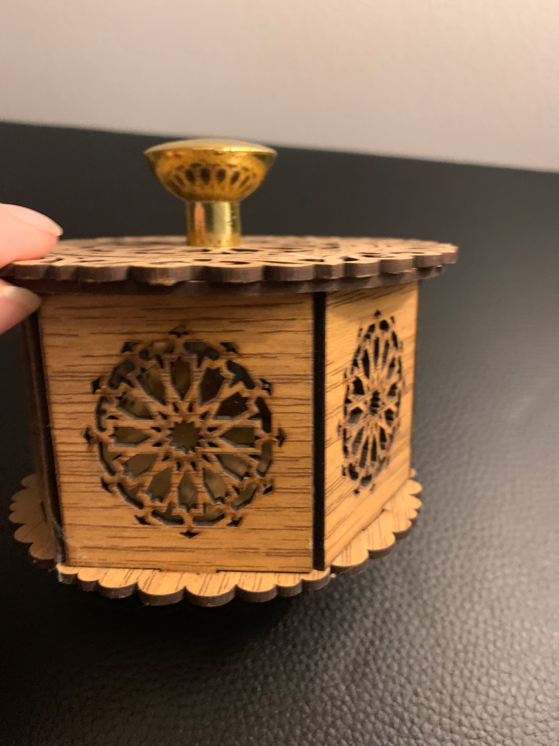 Boîte artisanale en bois ajouré – Motif oriental & poignée dorée