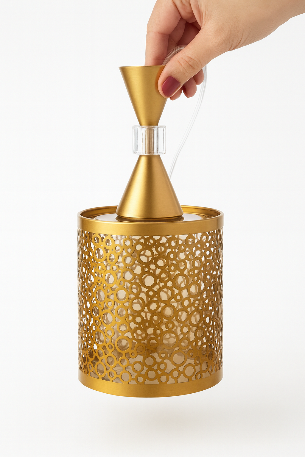 Cette suspension dorée au design cylindrique séduit par ses motifs circulaires ajourés. Sa finition raffinée reflète la lumière et crée une atmosphère conviviale et chaleureuse. Elle s’intègre parfaitement aussi bien dans un intérieur moderne que dans une décoration orientale chic.