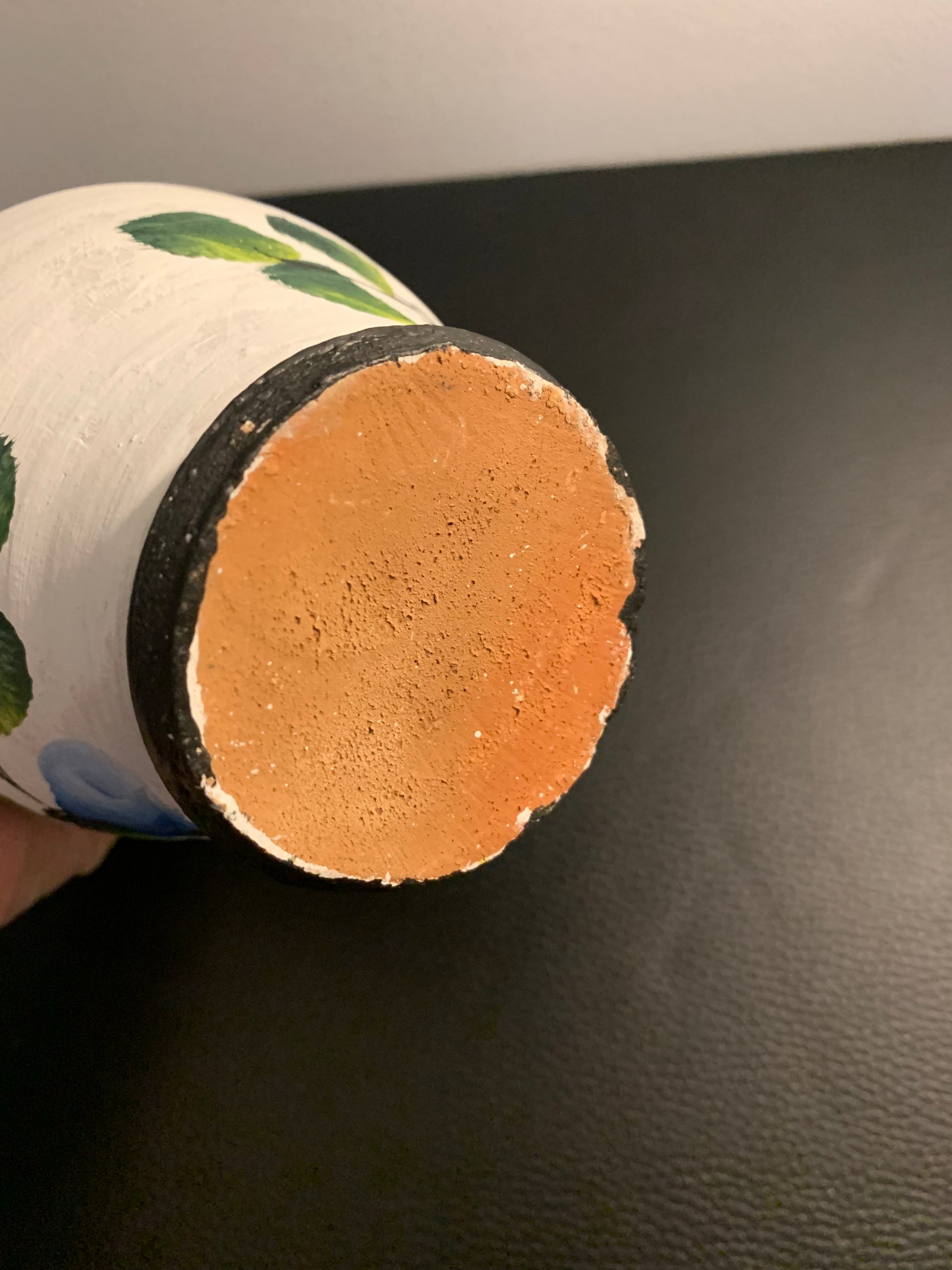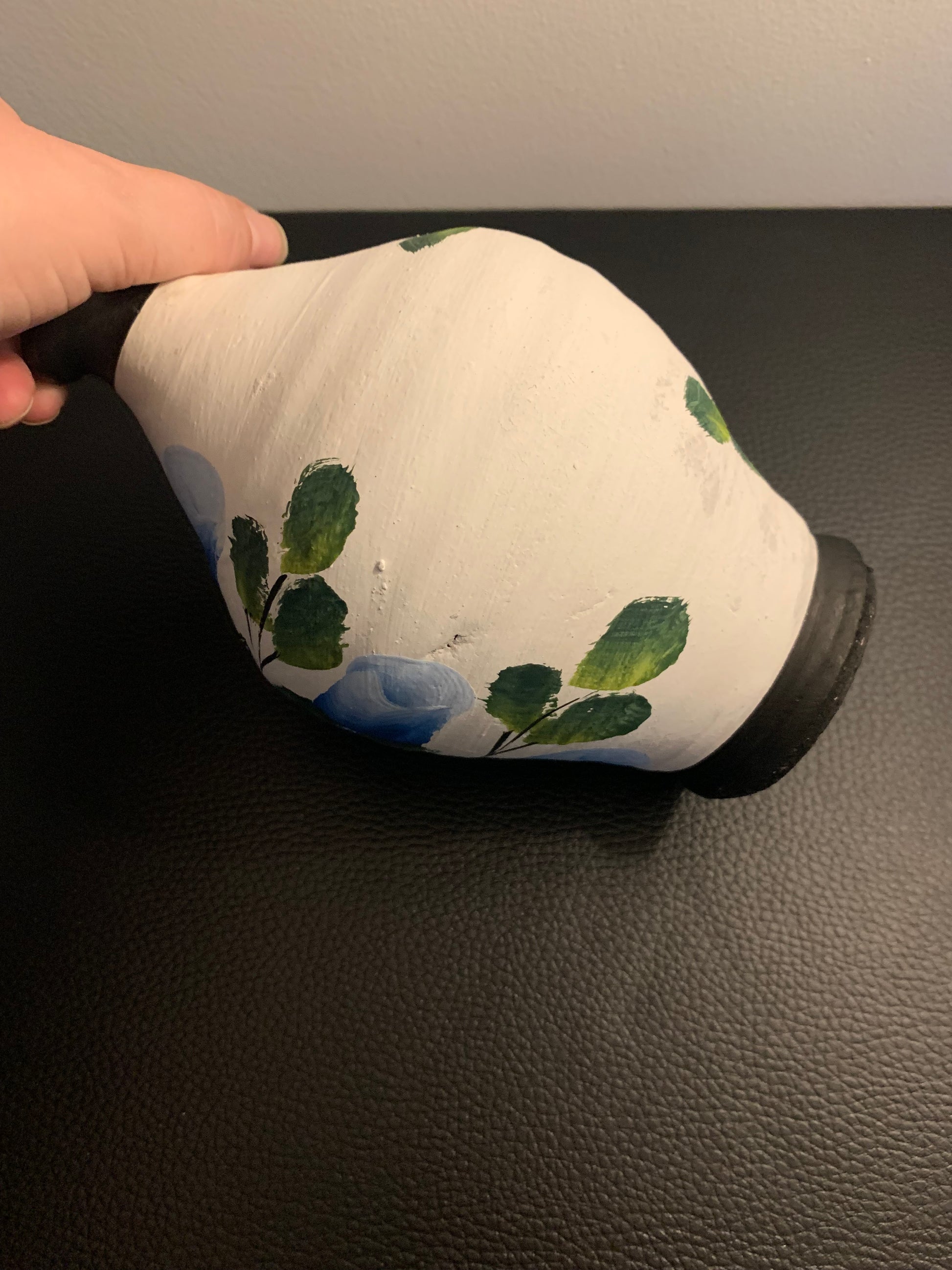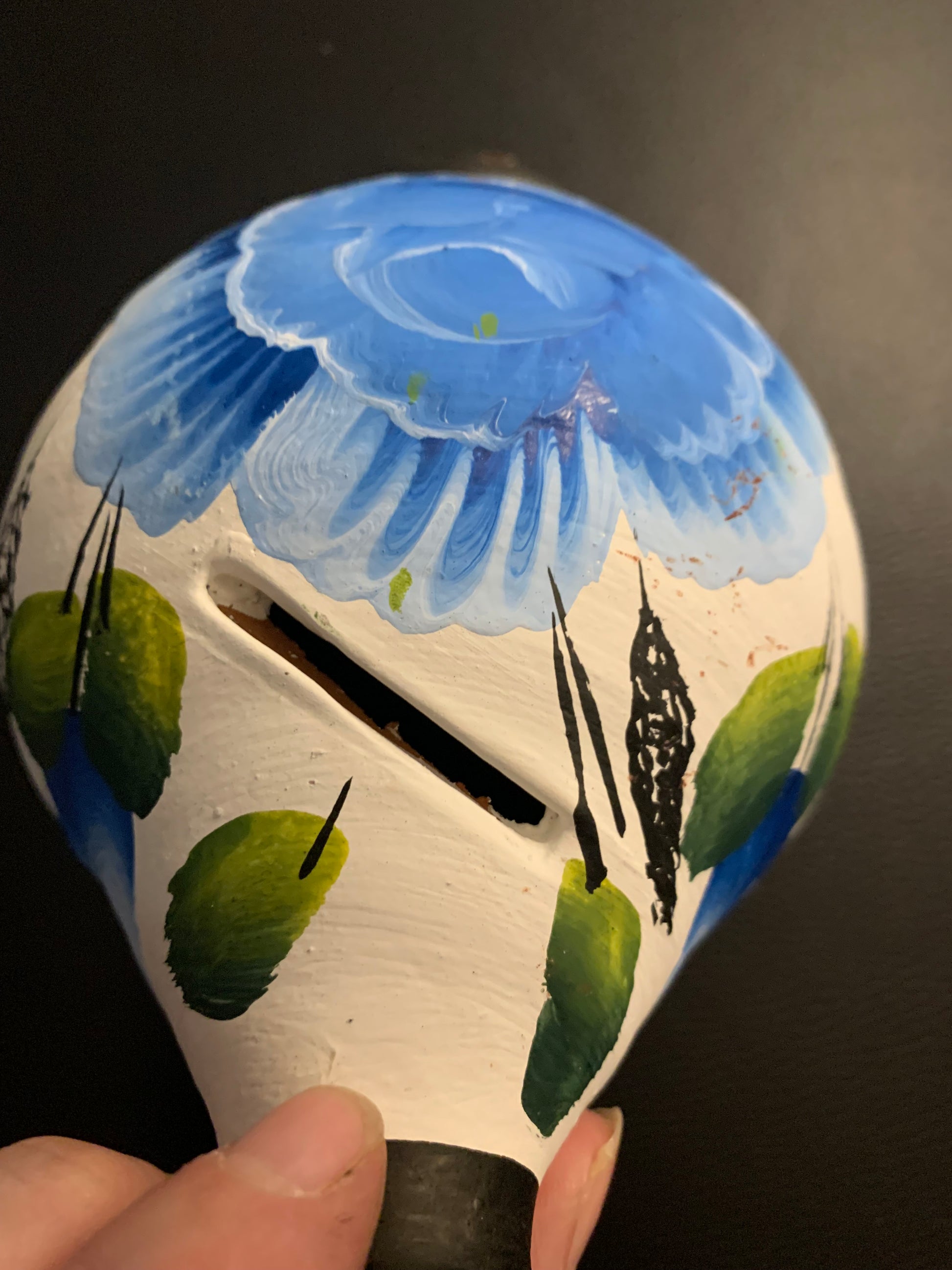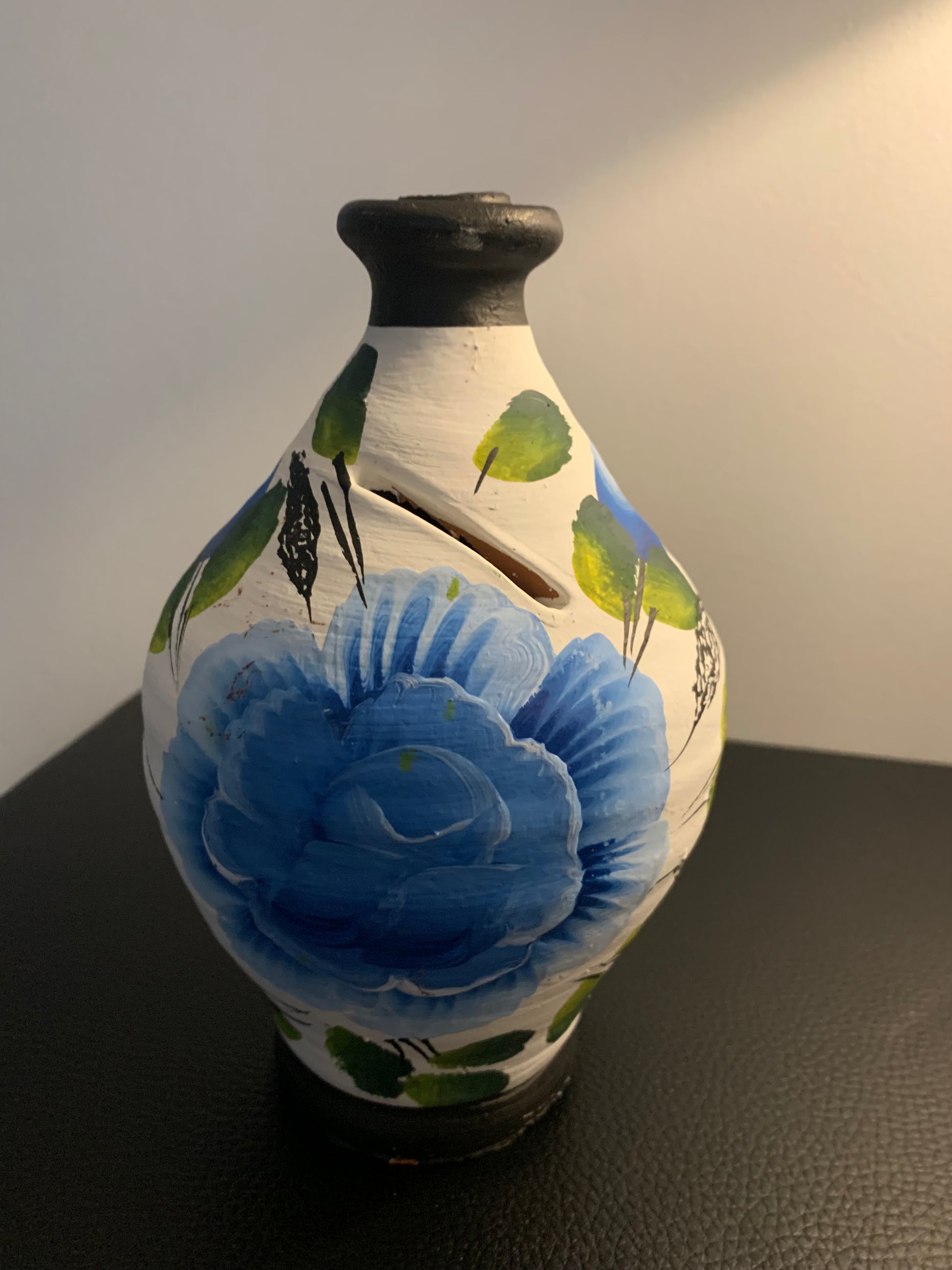 Superbe tirelire artisanale en terre cuite, peinte à la main avec un grand motif floral bleu et des feuillages verts. Originale et décorative, elle apporte une touche d’authenticité et de charme à votre intérieur tout en servant à garder vos petites économies.